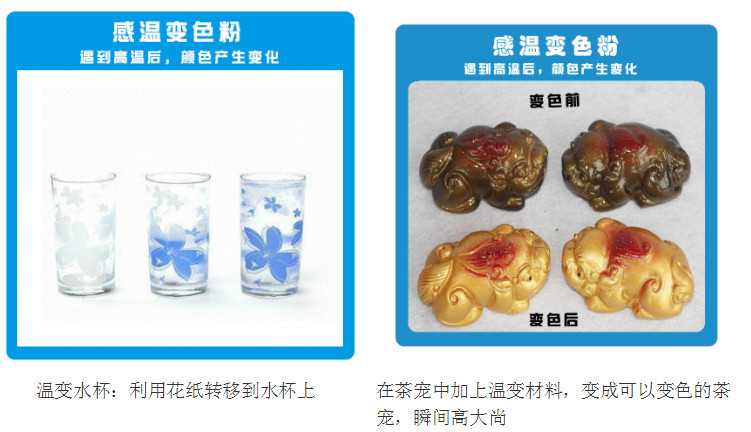 目前大多產(chǎn)品已經(jīng)讓消費(fèi)者產(chǎn)生了審美疲勞;沒有足夠的新品來吸引消費(fèi)者;而溫變粉變色顏料則足夠給您產(chǎn)品帶來新穎;如圖上的變色杯子、變色茶寵、變色貼紙等;現(xiàn)在的產(chǎn)品都是大同小異;但加上變色材料后,瞬間可以秒殺其他同款休閑包,這就是變色的魅力。買溫變粉就到廣州頂凡溫變粉生產(chǎn)廠家。電話:13378693789、020-29862888 周先生