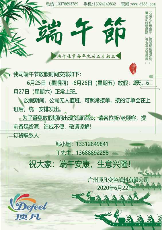 點(diǎn)擊:時(shí)間飛逝,轉(zhuǎn)眼間又是一年端午時(shí),又聞粽飄千里香,2020的端午佳節(jié)即將到來。廣州頂凡公司向全體員工及各位新老客戶致以節(jié)日的問候,為了度過歡樂、祥和的端午節(jié),公司放假時(shí)間為:6月25-26日、27號(hào)正常上班,放假期間,可照常接單,如需訂貨可聯(lián)系鄒經(jīng)理:13312849841。
