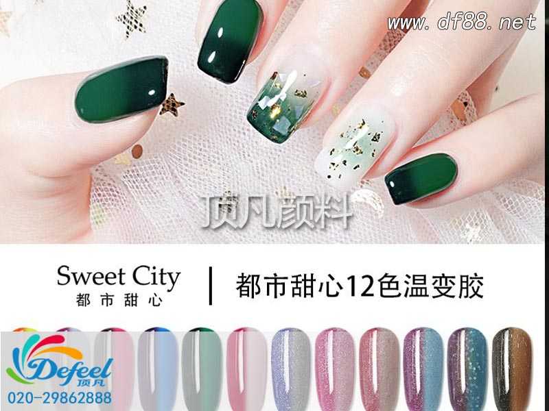 其實(shí)之所以變色美甲可以發(fā)生顏色的變化主要原因在于在指甲油里面添加了感溫變色粉,這種感溫變色粉是一種溫變顏料,它可以感受溫度的變化,在不同溫度下顯示不同的顏色,有多重溫度區(qū)間,根據(jù)溫度的不同大體分為低溫變色、手感變色、高溫變色等,我們將加熱時(shí)溫變粉開(kāi)始緩慢改變顏色時(shí)的溫度記為T(mén)1,將溫變粉變色完全時(shí)的溫度記為T(mén)2。常用溫變粉溫度區(qū)間為:0~5℃、8~12℃、18~24℃、26~31℃、29~33℃、38~43℃、45~50℃、50~54℃、60~65℃、65~70℃、70~78℃。通常,我們將變色完成的溫度定義為溫變粉的最終變色溫度。例如,31度溫變粉,其變色區(qū)間為26-31度,我們稱(chēng)為31度變色。