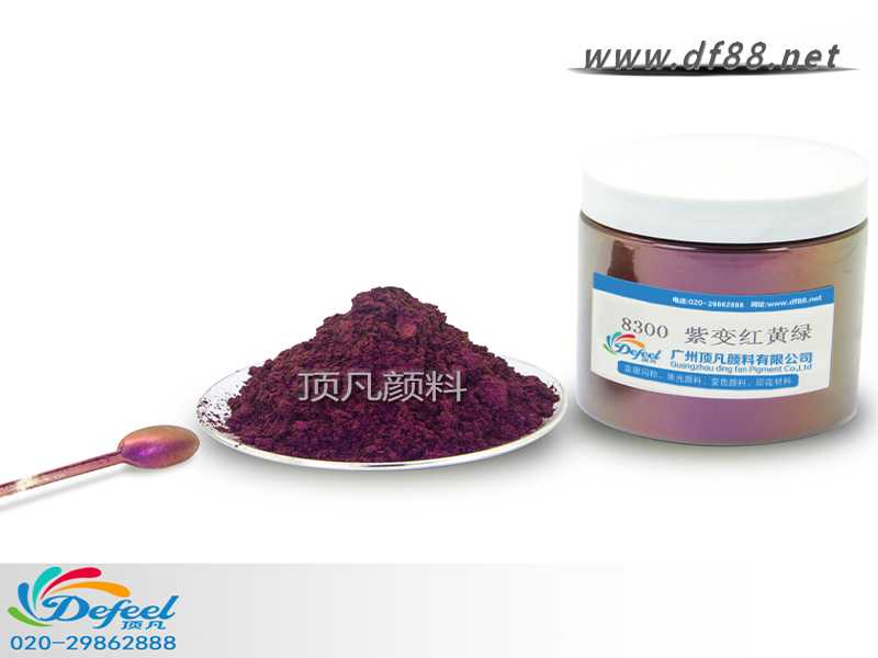 8300 紫變紅黃綠變色龍粉可應(yīng)用于涂料、油墨、塑料各產(chǎn)業(yè),產(chǎn)品之設(shè)計大多以室內(nèi)(無紫外光之環(huán)境)與室外(有紫外光之環(huán)境)有顏色變化為訴求。